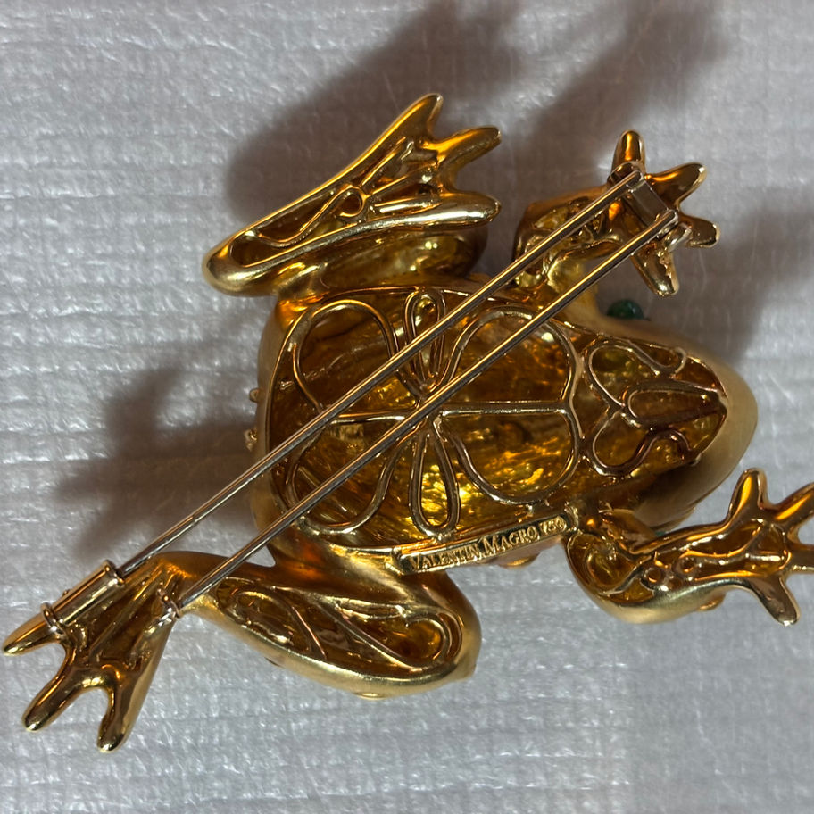 This extraordinary frog brooch is an authentic, high-jewelry creation attributed to celebrated designer Valentin Magro, renowned for his sculptural, whimsical animal designs and exceptional craftsmanship.
